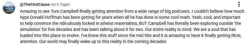 Die Sonne schafft was weg, jetzt sind es schon 8,9°C. Es ist noch viel auf dem Zettel, was liegen geblieben ist, da ich die letzten Tage zu spät aus der Falle kam, doch möchte ich hier noch anbringen, dass der letzte Podcast von tom, welchen ich hier vor vielleicht 4 Tagen vorgeschlagen habe, wirklich gut zu dem die Tage davor Geschriebenen passte, wi ich mich ausgelassen habe darüber, dass Bewusstheit generell nur in Virtualität möglich ist. Das eben auch keine Ausnahme macht vor was weiß ich für Wesenheiten, ob es nun unkörperliche, sonstige astrale wesen sind, oder auch, krishna, odin, vishnu, hanuman jesus oder was man auch immer aus Mystik und Mythen so kennen mag.