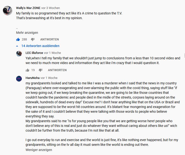 "Meine oma hat mir gesagt, dass damals im nationalen Sozialismus alle mitgemacht haben, und keiner den Mund aufgemacht hat, weil die allermeisten Angst hatten, vor Arbeitsplatzverlust, Mobbing, Ausgrenzung und ähnlichem"