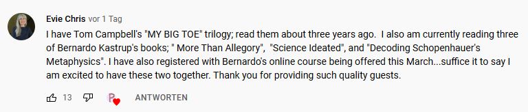 | "ich glaube, ein wichtiger Punkt, warum in Deutschland unsere Bücher so populär sind, liegt darin, dass sich unsere Diskussionen dem Idealismus nähern, beziehungsweise, dass wir uns analytisch, metaphysisch, objektiv und ontologisch mit einigen der reichsten Traditionen des deutschen Idealismus treffen, mit schopenhauer und anderen brillanten Denkern, die an dieser wahrheit dran waren. Ein Großteil ihrer Arbeit tritt mit dieser wissenschaftlichen Revolution in ein neues Licht ..."