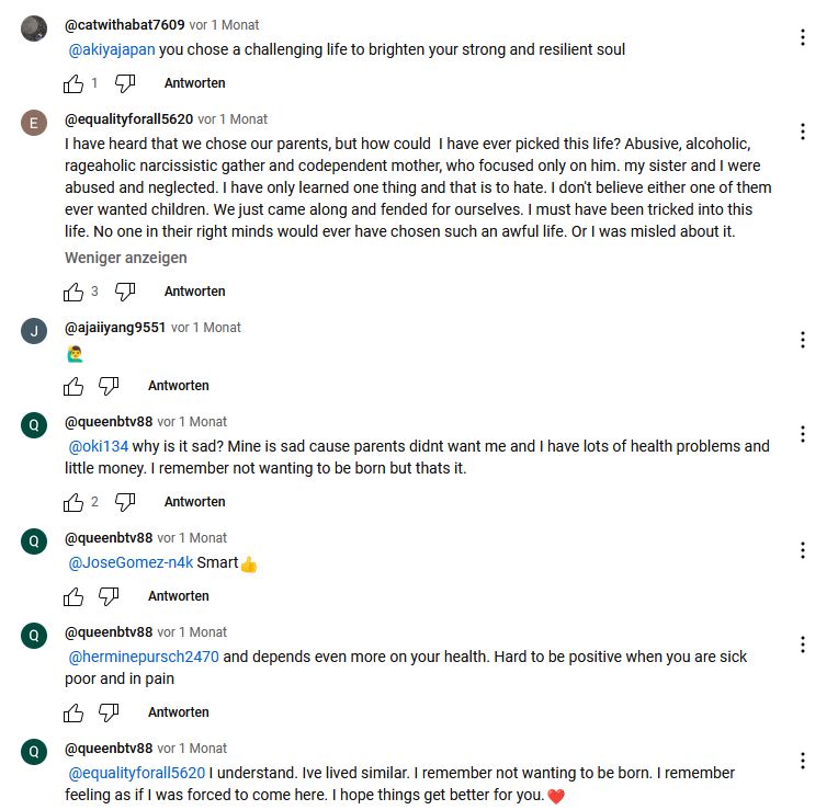 Hier also jetzt aaron, mit seiner "Vollversion" vom Reich gottes. Allerdings bleibt noch ein wenig in der Luft bezüglich der konsistenten Erklärung, oder Verständnisses, wie man sich ein recht "harsches" leben aussuchen kann, sich dazu bereit erklärt, erklären kann: "ok, das schaffe ich auch noch". Da sehen wir dann die menschen, welche ein "niederes" leben hier vollführen, voller Krankheit, Schicksalsschlägen und sonstigen Nachteilen und Leiden, auf einem Male mit völlig anderen Augen. Der "Winner" hier ist dann letztlich der eigentliche Looser, und umgekehrt.