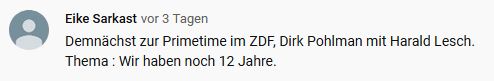 Was meinte oli janich noch, in oben verlinktem Video: "es ist genau umgekehrt, nämlich wenn die Forderungen der Klima-Religion umgesetzt werden, dann wird es hunderte von Millionen von Toten geben". https://youtu.be/uYKtk9pzst0?t=102