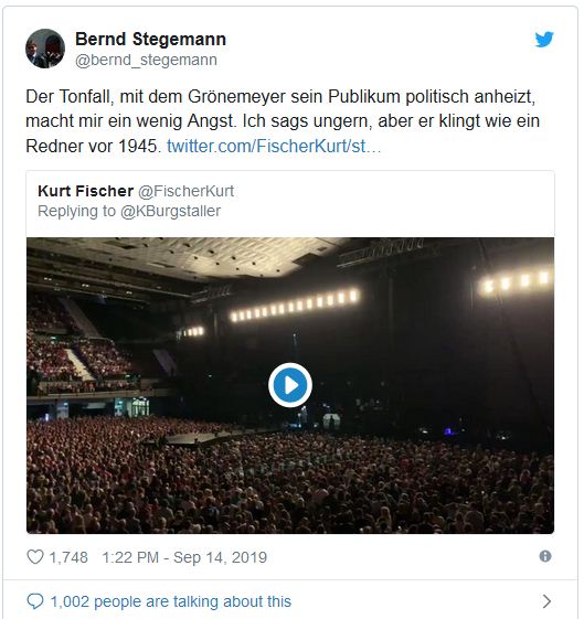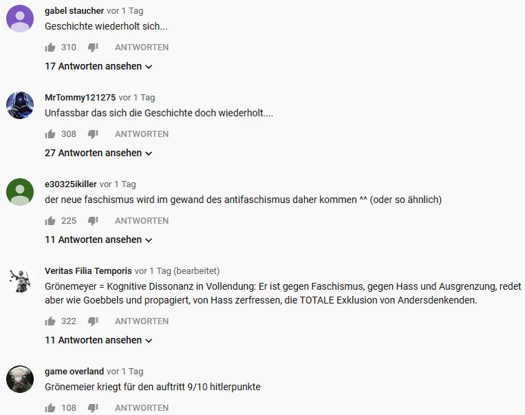 Nun, eigentlich wollte ich ja von dem ewig sich gleichbleibenden, jedenfalls dem Trivialen aus dieser Sparte, mich fernhalten, um eben keine Zeit zu vergeuden, doch hier passt natürlich Grönemeier gut hinein, in eines meiner Kernthemen, nämlich den sich offen, wie man sieht, jetzt zeigendem Faschismus.