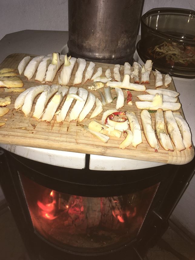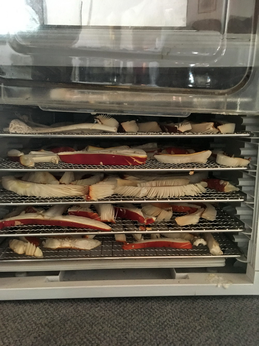 Und diesmal habe ich, haben wir alle Fliegenpilze bis ~ 4 cm stehen lassen, da diese erstmal heranwachsen. In 2-3 Tagen gehe ich wieder in den Wald, dann müsste die kleinen eigentlich auch die richtige Größe haben. Diesmal hat es auch wieder gelangt, um den Dörrautomaten fast voll werden zu lassen, + nochmal 2 Gläser Fliegenpilz unter Vodka. Das färbt sich nachher alles schön tief rot. je nachdem, welche Intensität des roten Farbtons die Pilzhüte haben.