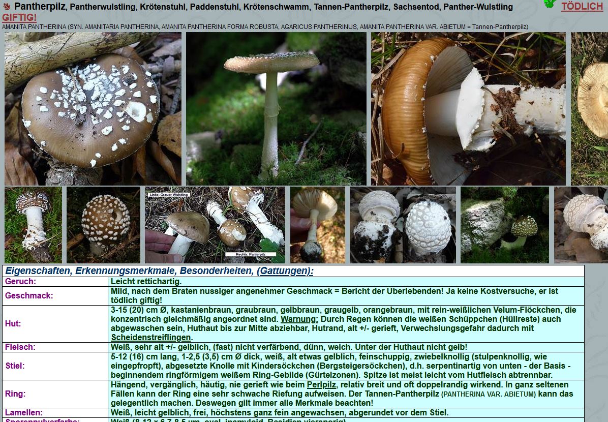 Soweit ich weiß, wurde der Pantherpilz auch früher "Sachsentod" genannt, weil die Sachsen fast nur Perlpilze, aber keine Pantherpilze haben/hatten, doch - wenn in anderen Gefilden unterwegs, verwechselten viele den Pantherpilz mit dem Perlpilz, welche sich, auf den ersten Blick, ähnlich sehen. Und wenn man davon gleich eine ganze Pfanne voll macht und mampft, kann das natürlich schief gehen.