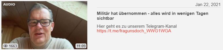 "Der Deep State und die Massenmedien glauben, dass sie jetzt wieder die komplette Kontrolle haben. Trump ist von der Bildfläche verschwunden, er ist nicht länger Präsident. Manchmal muss man sich für das Allgemeinwohl aufopfern, für eine höhere Sache. Und das ist die Beseitigung des Deep-State-Systems. Es ist wie beim Schachspiel. Um an sein Ziel zu kommen, um zu gewinnen, musst Du einige Figuren opfern. Wir sprechen später über all das, doch zuerst schauen wir auf das Vertrauen der Menschen in die Berichterstattung der Massenmedien." https://qlobal-change.blogspot.com/2021/01/x-22-report-vom-2112021-manchmal-muss.html