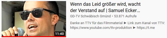 Wahnsinn. Mir fehlen die Worte um ausdrücken zu können was für eine Liebe ich für Samuel empfinde. Zwischen April und Mai war eine sehr dunkle Zeit für mich. Kaum bis gar nicht verstanden gefühlt von anderen Menschen, die sich ohne Hinterfragen Alles was Ihnen befohlen wurde gemacht haben. Bis ich das Video mit den PCR-Tests gesehen und Samuel entdeckt habe. Ich weiß jetzt auch , dass ich nicht allein bin. Ich hoffe, ich schaffe es, meine Frau auch aus ihrem Schlaf rauszuholen. Samuels fester Glaube an Gott, an das Gute ist sehr inspirierend. Das hat mich an einen Spruch aus meiner Jugend erinnert: "Gott und ich, die absolute Mehrheit". Danke Samuel für Alles was du tust.